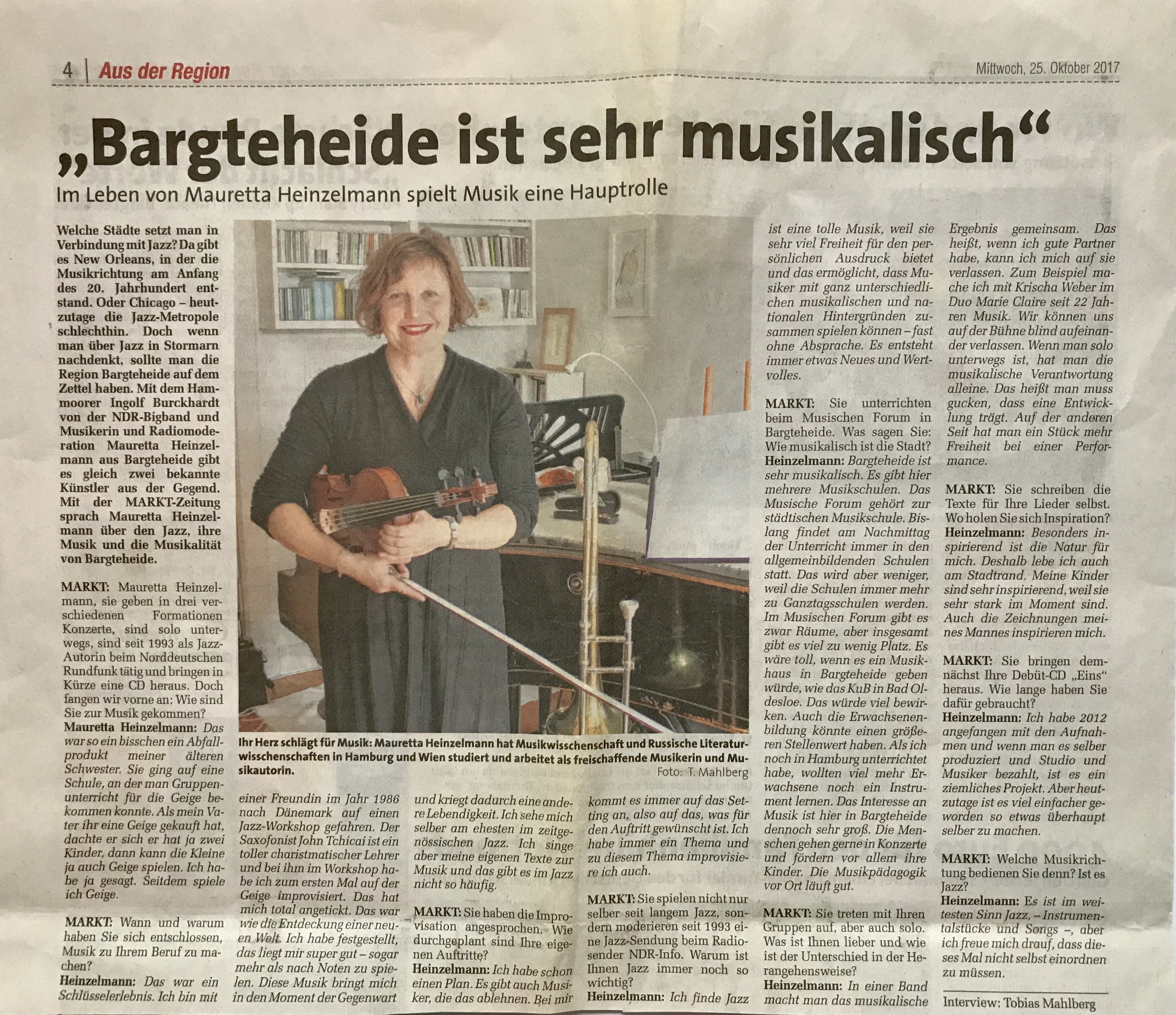"Mauretta Heinzelmann begeisterte mit ihrer Stimme ebenso wie mit ihrem Violinspiel" - "humorvoll und experimentierfreudig!" (Cordula Eickmann im Stormarner Tageblatt)