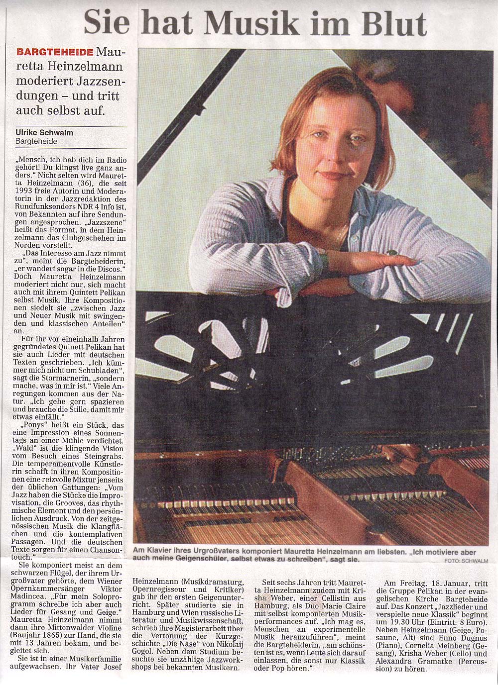"Interessanter und beachtenswerter Mittelpunkt des Abends war der Auftritt von Mauretta Heinzelmann. In den von ihr präsentierten Stücken trat sie gleichzeitig als Komponistin, Geigerin und Sängerin hervor. Mit ihren ungewöhnlichen Eigenkompositionen für Violine, die einen ganz besonderen Ton zwischen der Experimentierfreude der Neuen Musik und dem gefühlvollen Ton der Romantik trafen und über die ihr eigener Gesang noch ein paar geswingte Tupfer legen konnte, spielte sie sich mit Charme und Selbstbewußtsein in die hohe Achtung der Zuhörer." (Friederike Sablowski im Stormarner Tageblatt 6.11.2001)